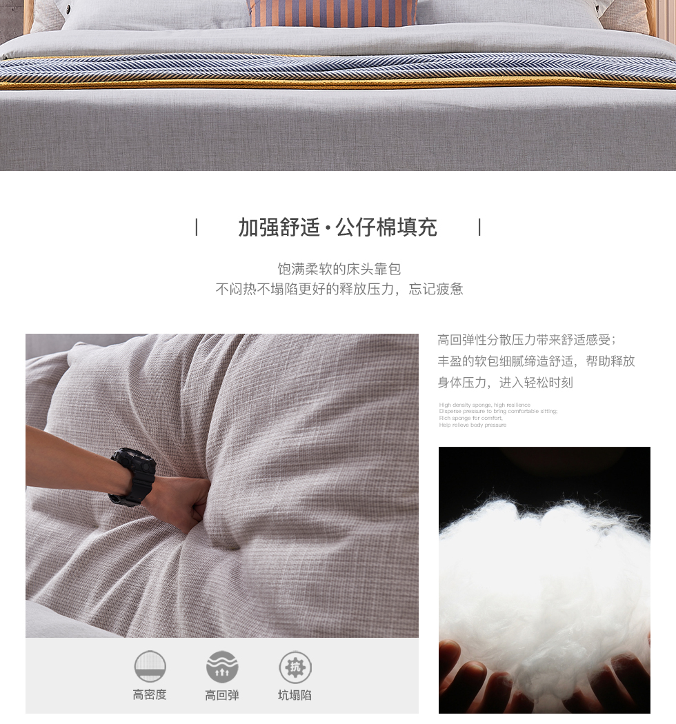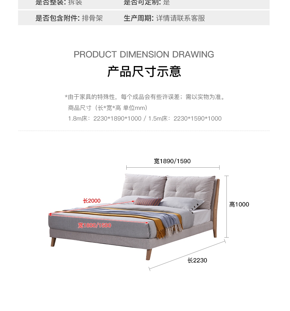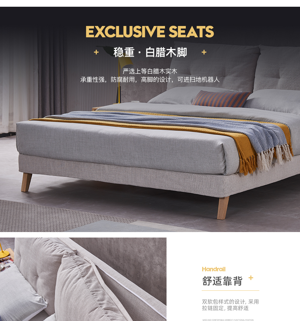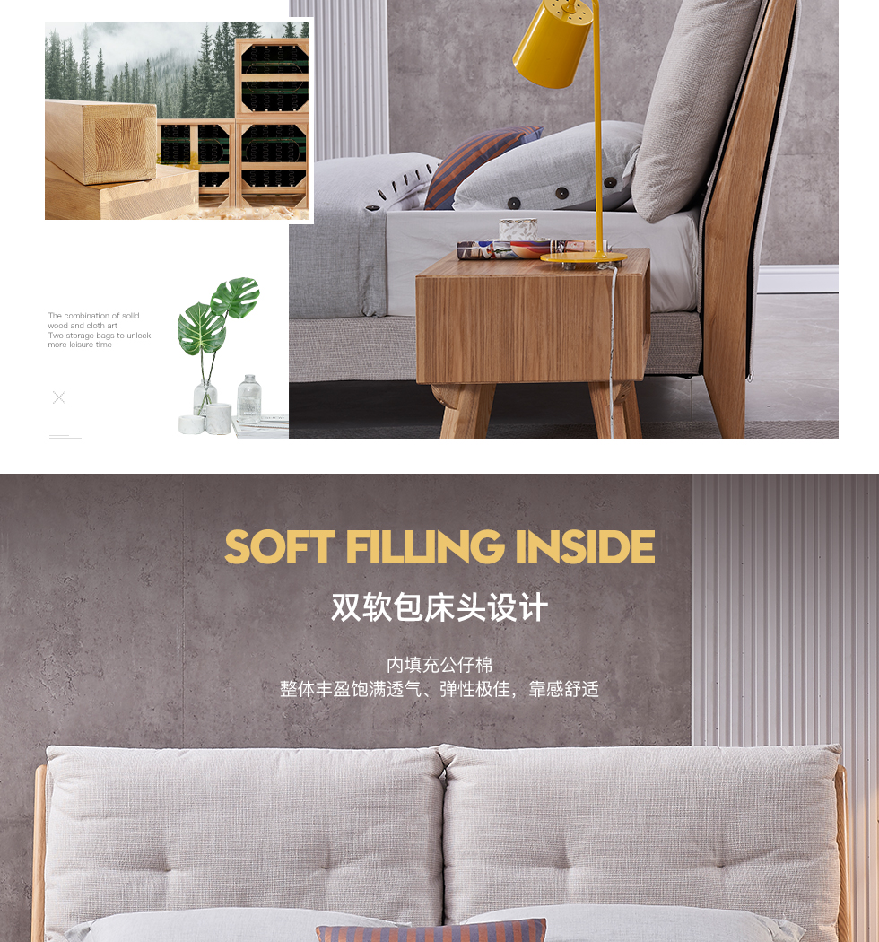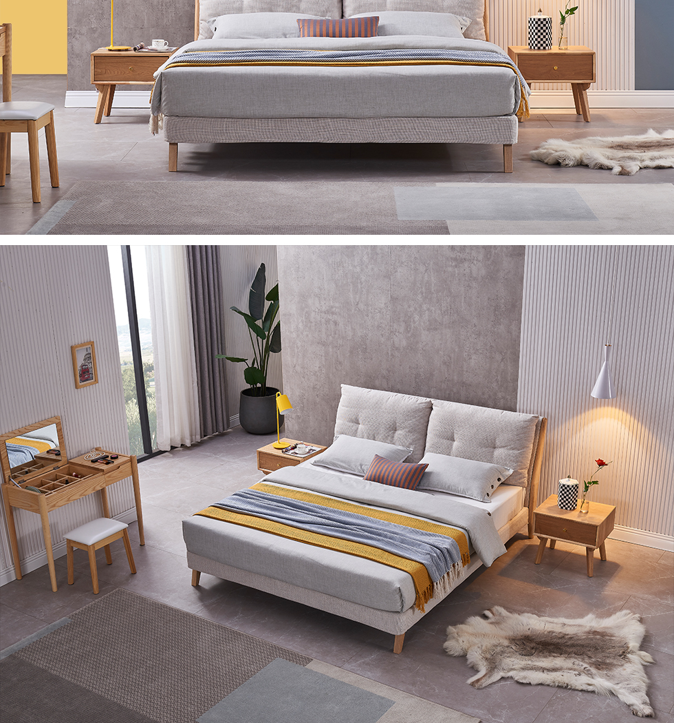 青涩 北欧 1.8米软包床 红橡+多层实木板+科技布