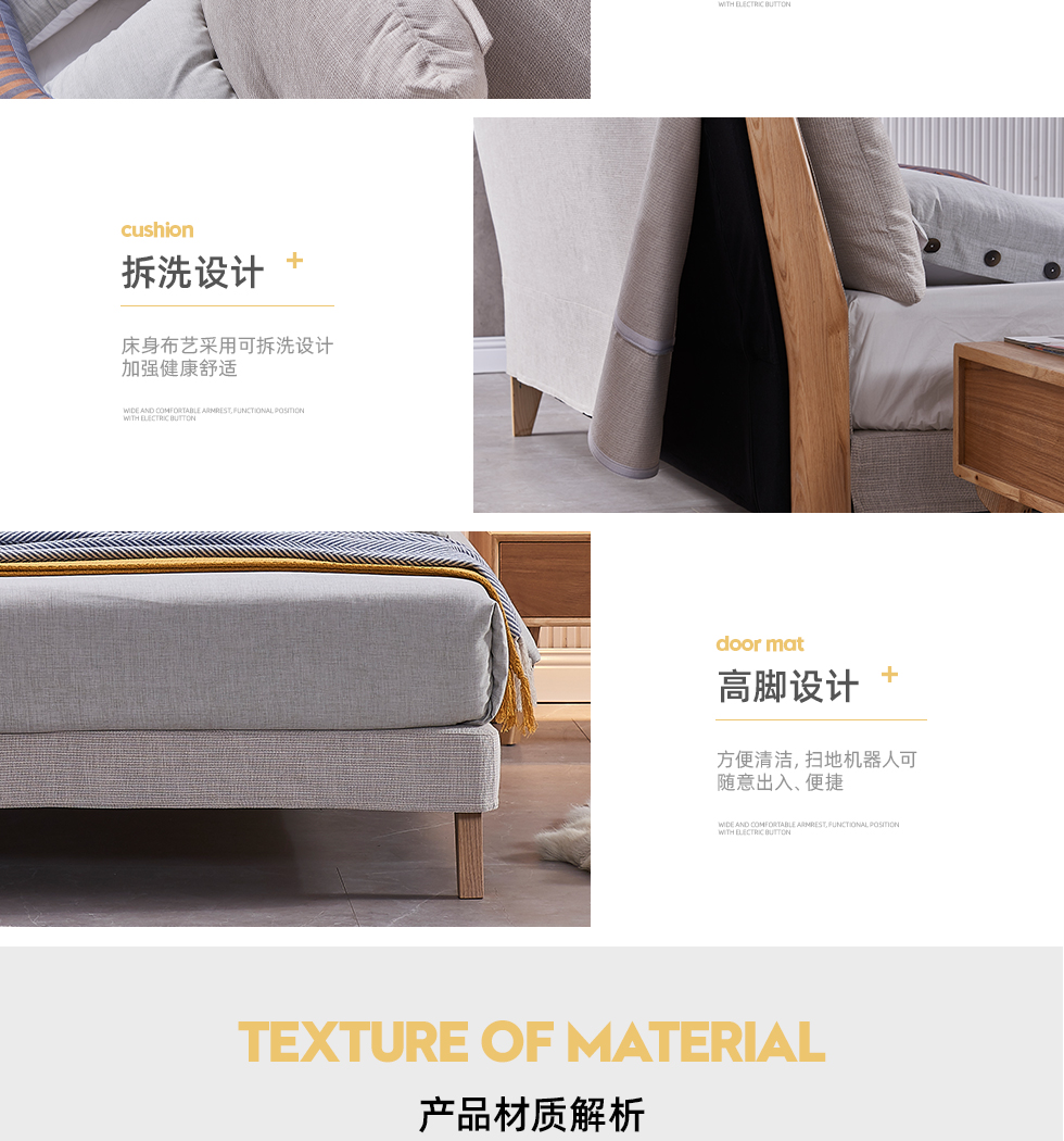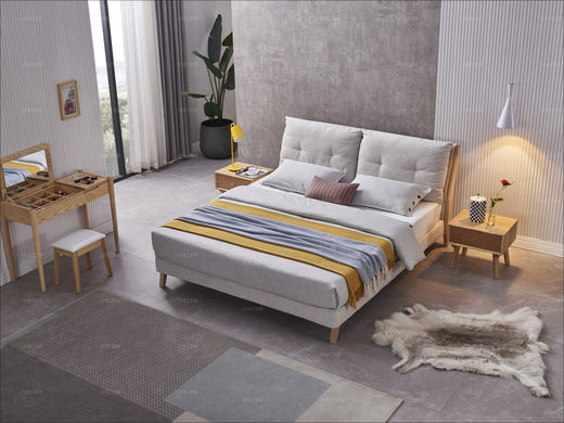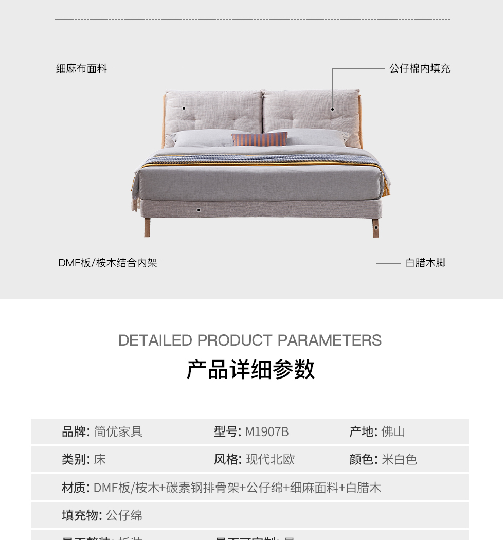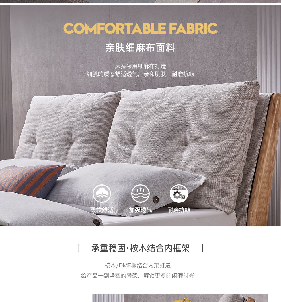 简优家具 1.5m床 现代北欧 DMF板/桉木+碳素钢排骨架+公仔绵+细麻+白腊木 |