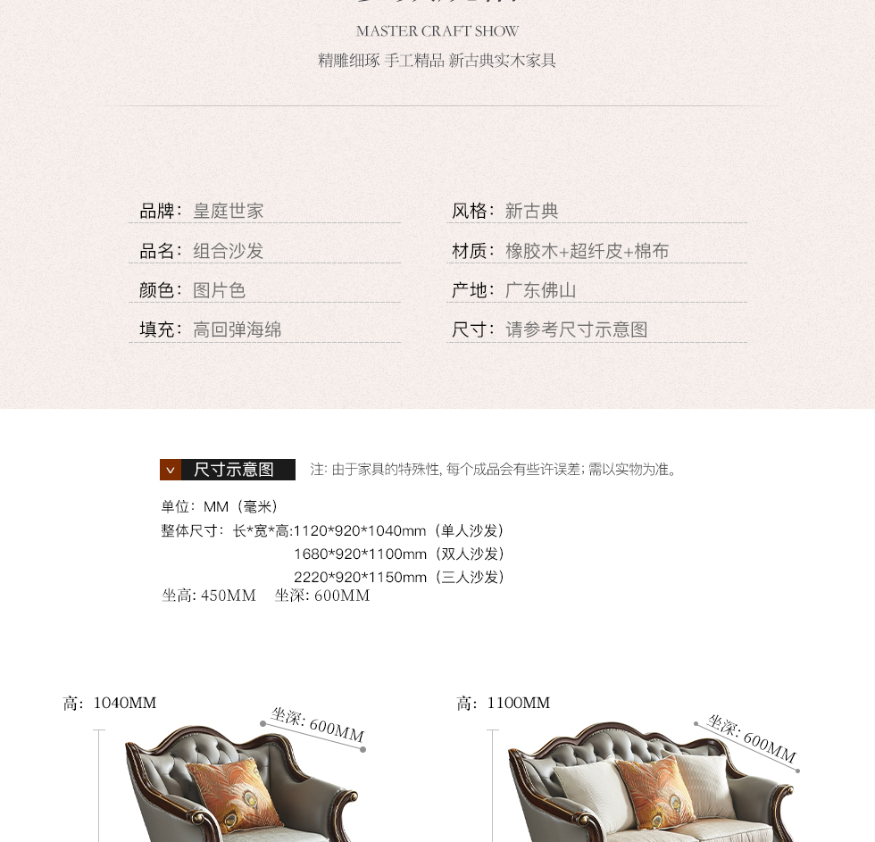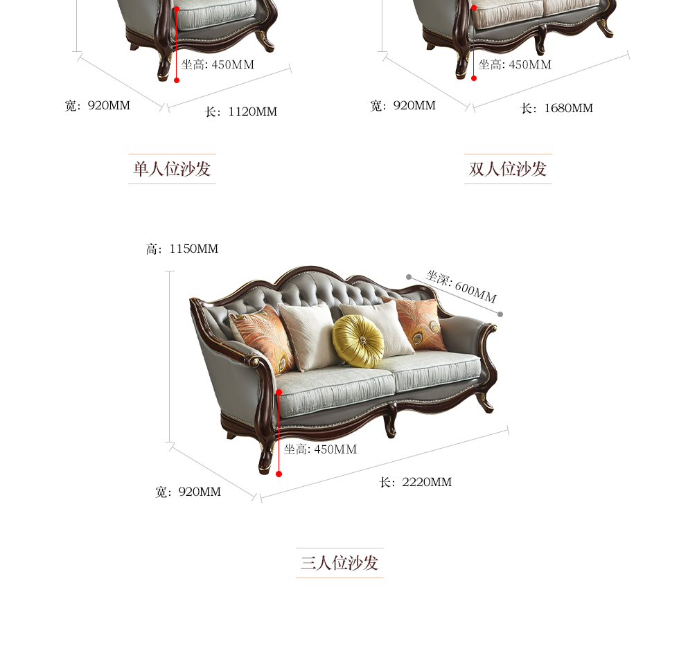 | 一级风格:新古典 | 产地:佛山 | 产品尺寸:单人沙发1120*920*1040mm 双人沙发1680*920*1100mm 三人沙发2220*920*1150mm |