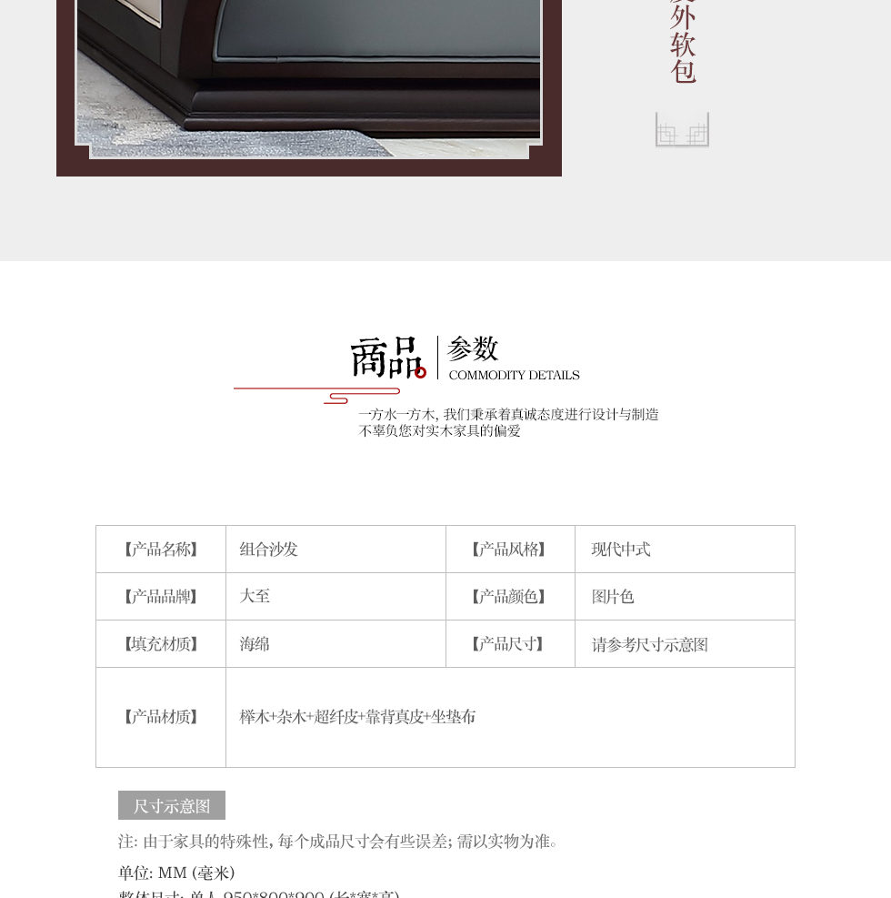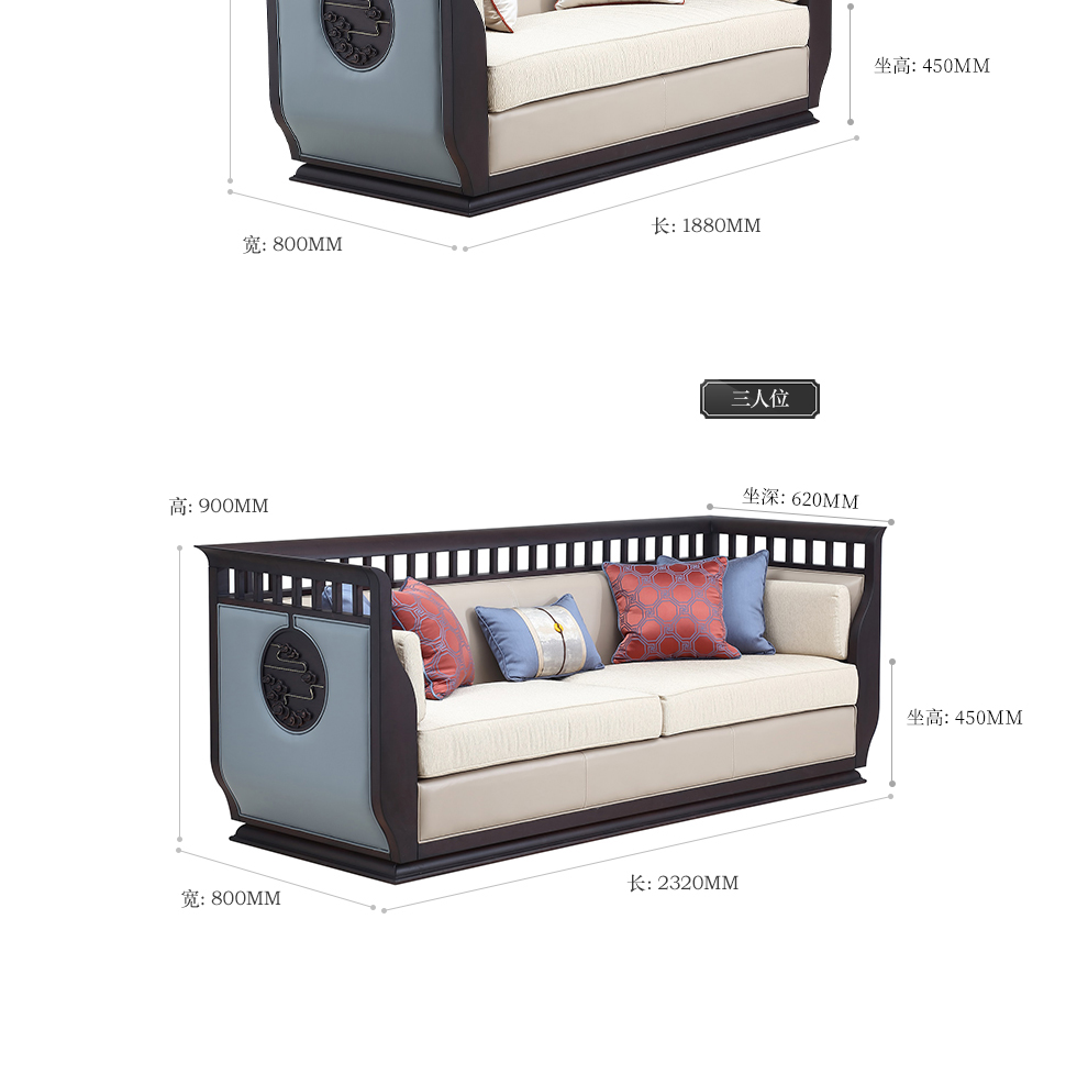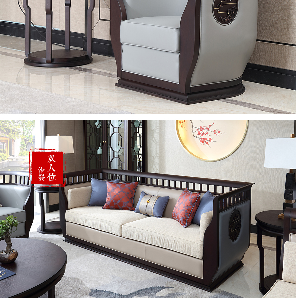 大至 新中式 两人沙发 榉木+杂木+靠背真皮+坐垫布¥2785