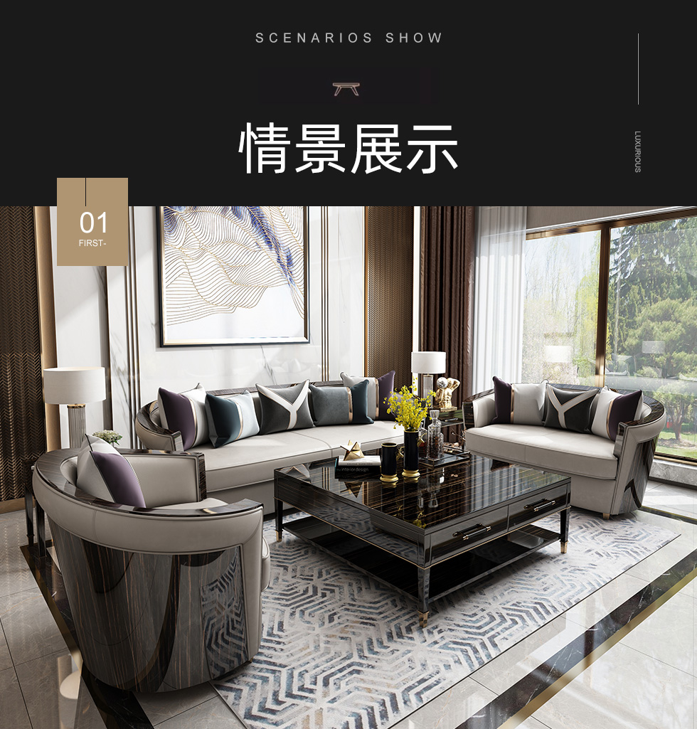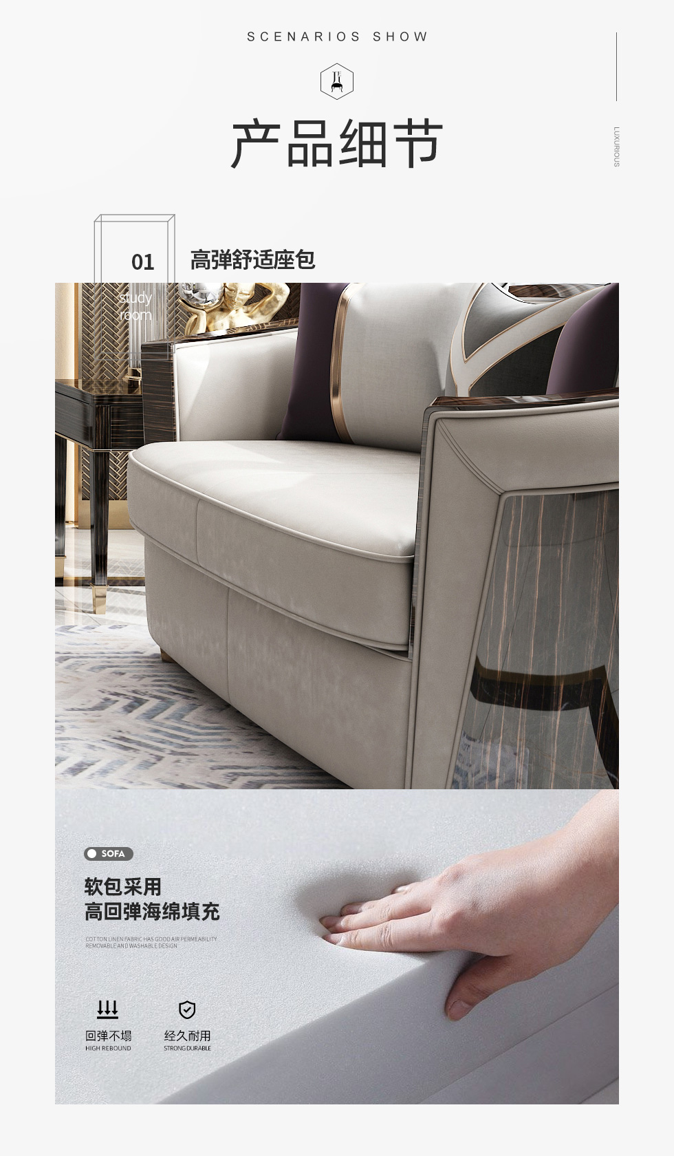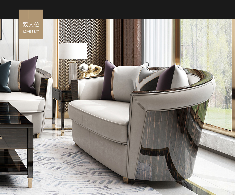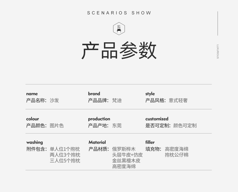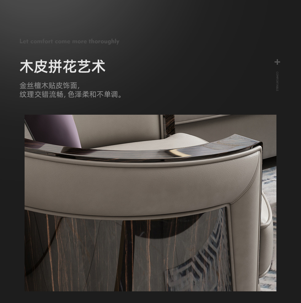 梵迪 1+2+3组合沙发 意式.轻奢 俄罗斯桦木+头层牛皮+仿皮+金丝黑檀木皮+高密度海绵 |